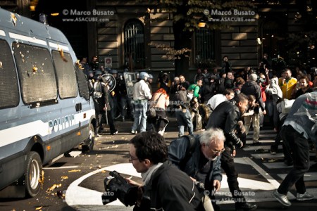 Lancio di frutta verso le forze dell’ordine che bloccavano la strada di accesso a Fininvest durante il corteo studentesco/indignati/save school not banks del 14/10/2011 a Milano