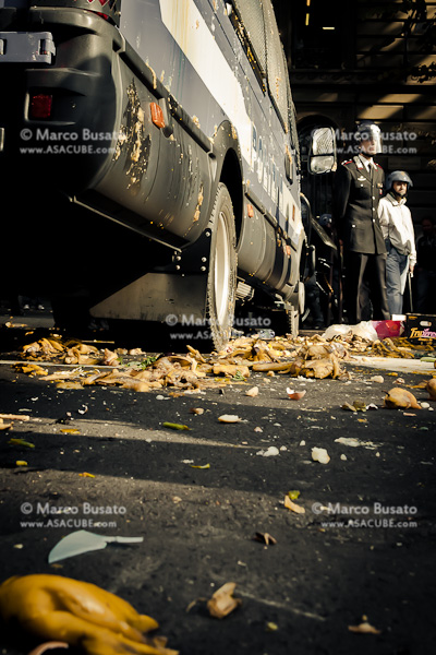 Lancio di frutta verso le forze dell’ordine che bloccavano la strada di accesso a Fininvest durante il corteo studentesco/indignati/save school not banks del 14/10/2011 a Milano