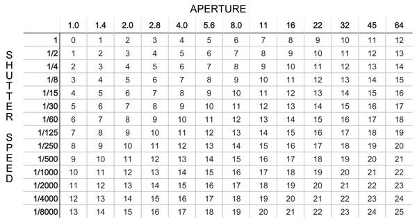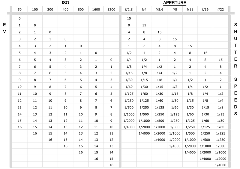 Below I suggest an exemplary data table of how to exploit the EV value in combination with the Sunny 16 rule based on different iso settings but keeping 1/125 as shutter speed: